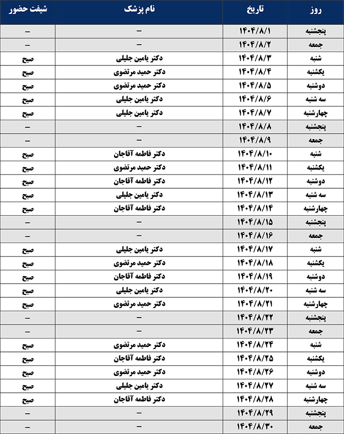 برنامه حضور روانپزشکان درمانگاه کامرانی (شوش) /// آبان ماه 1404